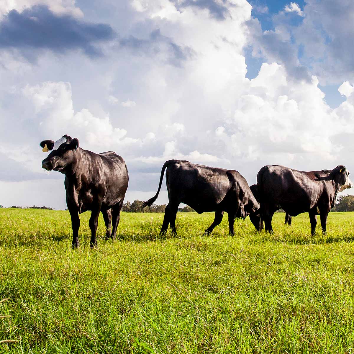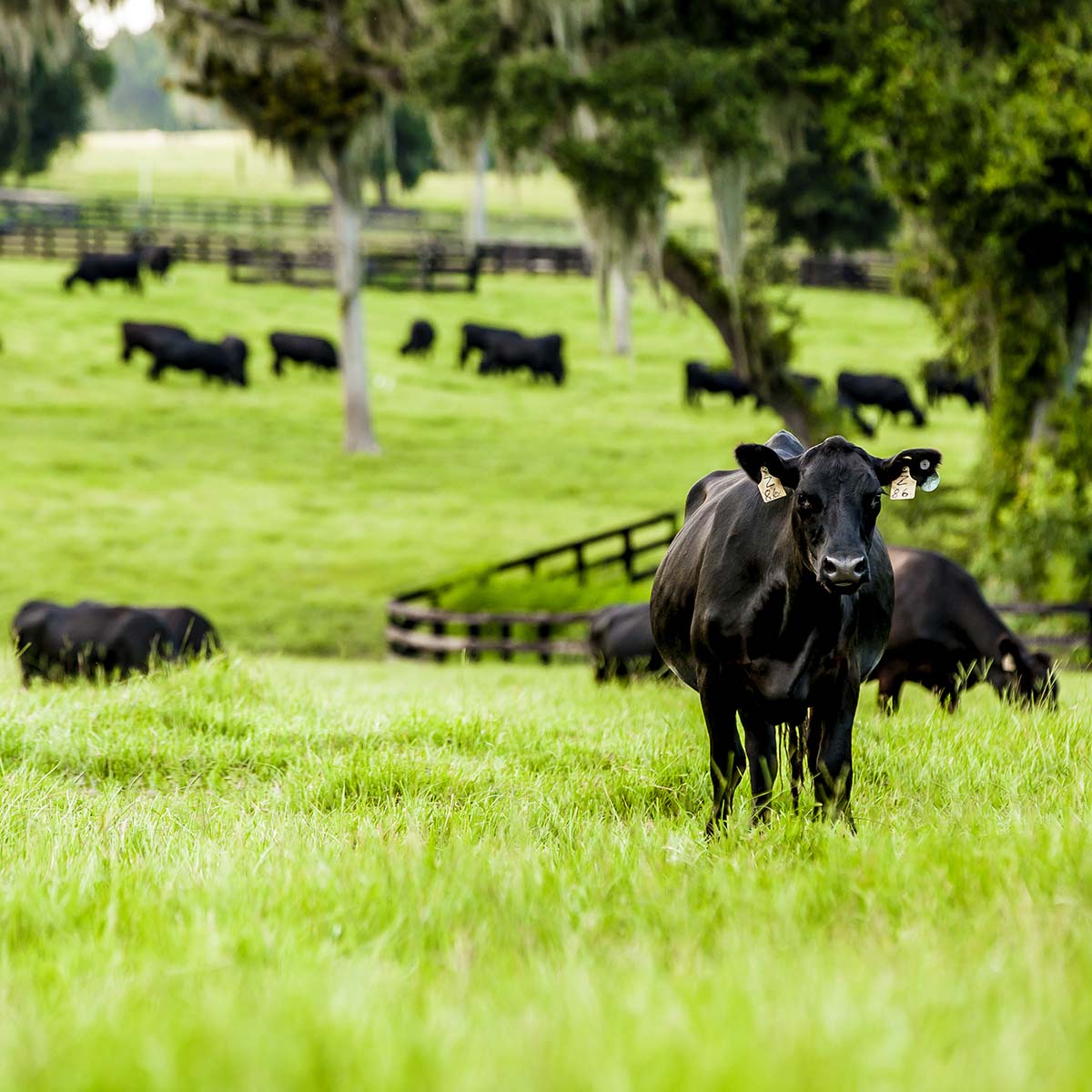 Our cattle are raised in southern Georgia and northern Florida. The climate here is perfect for our cattle to graze year-round out in the open air, eating fresh green grass on wide-open pastures filled with spring-fed ponds and big old oak trees with plenty of shade.
